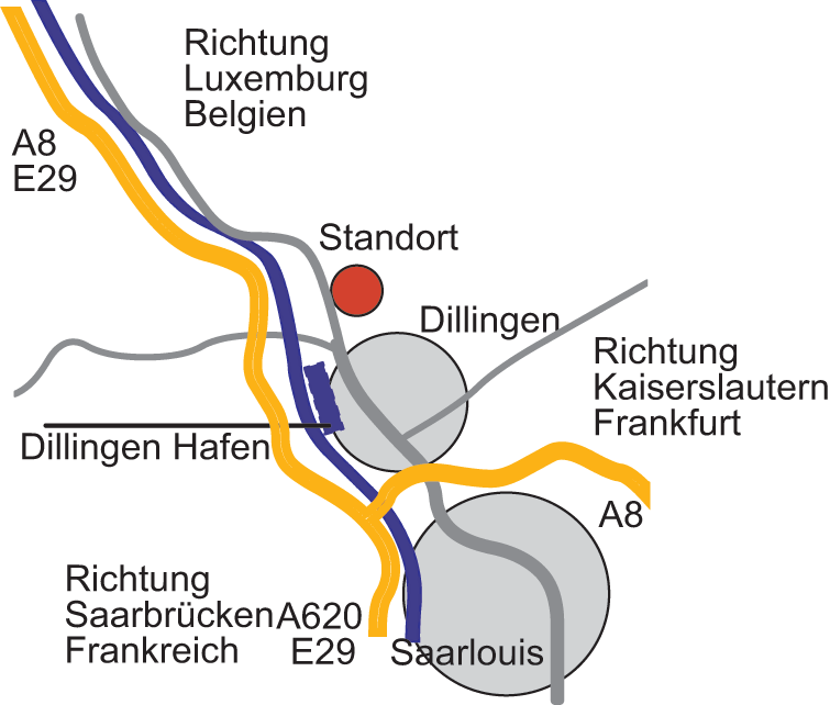 Dillingen im Saarland verfügt über eine gute Anbindung an das europäische Fernverkehrsnetz mit der Verkehrsachse Saarbrücken – Luxemburg (E29) und den Autobahnen A8 und A620.